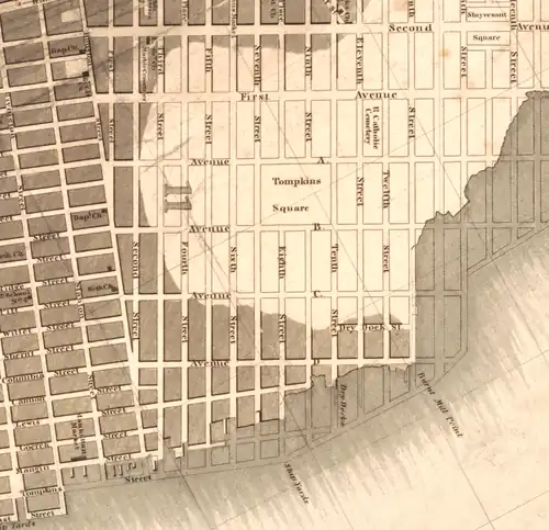 "In general," the commissioners resolved, everything "should be rectangular."[42] However, the new roads were rotated relative to the existing ones just below Alphabet City. Moreover, the commissioners could do little to straighten the shoreline. They were limited by charter to reclaiming 400 feet beyond the low-water mark, much less than the Mangin-Goerck plan entailed.[43] First Avenue reflected this limit. It was drawn parallel to Fifth Avenue (called Middle Road in earlier designs[44]) as far east as possible while not straying too far into the water. Irregular bits of land protruded beyond First Avenue and, for these cases, the commissioners turned to lettered avenues. Avenues A and B appeared around Alphabet City, popped up again above midtown, and once more in Harlem (they were eventually renamed or eliminated above Alphabet City). Avenues C and D existed only in Alphabet City. Thus the neighborhood was misaligned with the old grid and relatively disconnected to the new one.