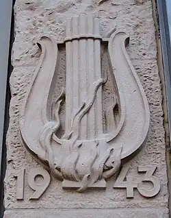 Memorial relief of a lyre with flames by Willi Hoselmann at the Karstadt building (ca. 1952)