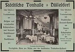 In 1818, the first Lower Rhenish Music Festival, constituted by the Städtischer Musikverein zu Düsseldorf, took place in the Geisler'schen Lokal, which became the centre of music lovers from 1830. It was a restaurant with a large wooden hall, which had already been known as Becker's Gartenlokal. In the Geisler's Hall, the audience in 1850 was close to 1000 visitors.[1] In 1863, the city acquired the pub, which was already called Tonhalle at that time.[2]