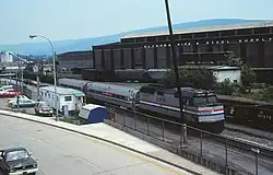 A westbound Pennsylvanian stops at the temporary station, June 1981