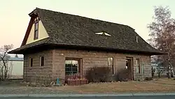 The depot was constructed from stone blocks from a local quarry and is placed with its longest side parallel to the railroad tracks. The eastern facade, which overlooks the tracks, has a centrally located operator's bay, with the former baggage room to the north and the former waiting room to the south.[2] It is largely unmodified from its days as a passenger depot, and is built in the late Queen Anne style, with an appearance more in common with contemporary stations in the eastern United States than other stations in California.[3]
