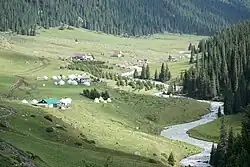 Altyn Arashan (Golden Spa) is a valley and mountain resort near Karakol and Issyk Kul Lake, northeastern Kyrgyzstan. It lies along the trekking route from Teploklyuchenka (Ak-Suu).[1] It is a hot spring development set in an alpine valley, containing the 5020 metre Pik Palatka in its southern part. It is said to "include three groups of nitric thermals springs on the right side of the Arashan River, 20 km southeast of Karakol mountain, situated in a picturesque forest landscape at an altitude of 2350-2435 metres."[2] The resort has numerous wooden sheds which contain hot sulfurous pools to cure various ailments.[3] The resort is set in a botanical research area called the Arashan State Nature Reserve which has about 20 snow leopards and several bears.