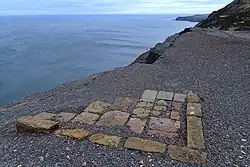 The alum trade died-off largely as a result of aniline dyes (derived from coal-tar), which were introduced in 1856, being cheaper and less labour intensive to exploit.[50] Whilst alum workings ceased operating in the second half of the 19th century, commercial exploitation of alum continued in the Sandsend area for a type of cement until well into the 20th century. The product was known as Mulgrave Cement, and was made at a plant in East Row (Sandsend) between 1811 and 1936.[51][52] The cement was widely used locally for vases, tiles, pipes, chimney pots and concrete blocks.[53] Some of the old alum sites have gained listed protection, whereas others, such as those at Saltwick Bay, have seen erosion destroy the old alum house on the beach, and coastal erosion threatens the entire site.[54]