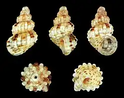The imperforate, white shell is solid. It is covered with rounded nodules by the intersection of longitudinal and spiral ribs. The shell contains five whorls, slightly convex, with a rather deep suture. The outer lip is thickened and margined.[2]
