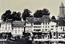 Gossauer's first own photo atelier "Photographie A. Gossauer", photographed by herself around 1880. The photograph shows the present Seequai in Rapperswil, where at that time the Zürichsee-Schifffahrtsgesellschaft (ZSG) landing gate was situated, Lindenhof hill and the Rapperswil Castle's Gügeli tower in the background.