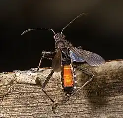 Alydus calcaratus is a large (10.0 to 12.0 mm), oblong and mainly blackish-coloured bug. The head is as wide as the pronotum, the rear corners of the pronotum are rounded. The hind leg (femora) of the males are thickened and have several strong spines on the underside. As with all the other species of the family (Alydidae), the antennae have four segments, of which the fourth is curved. The body is blackish, the dorsum of the abdomen has a bright orange patch, which is visible only in flight. They resemble spider-hunting wasps such as Arachnospila.
