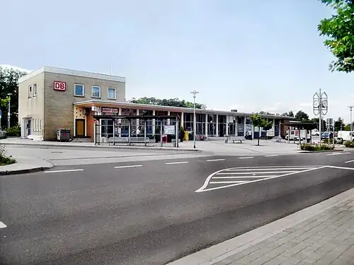 The station building and the nearby freight yard were built from Flonheim sandstone. The station, as restored in the 1920s, had a waiting room for first and second class passengers and another for the third and fourth class.[7] At noon on 19 October 1944, the station building was destroyed by an air raid. Until the late 1950s, a shed was used as a substitute before the new building was opened in 1960.[8] Until then, passengers were allowed through the ticket gate only with a valid ticket or visitors with a platform ticket.