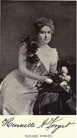 Madame Forget served as honorary president of the Imperial Order of the Daughters of the Empire and of the National Council of Women. She volunteered with the Victorian Order of Nurses and the Aberdeen Association. She served as president and treasurer of the committee to erect a statue to Queen Victoria.[3]