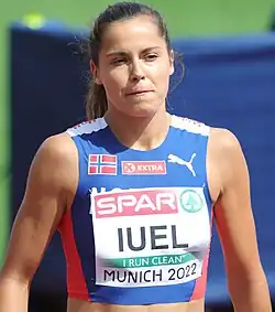 Amalie Iuel was born in Denmark to a Danish mother and a Danish-Norwegian father; the family moved to Norway when she was two years old, and she spent most of her childhood there.[2][3] The Iuels left Norway when Amalie was twelve due to the demands of her father's job with Telenor; they first moved to Namibia, and later Pakistan, the United Arab Emirates and Thailand.[2] Iuel took up track and field as a young girl in Norway, but did not pursue it seriously before her time in Thailand at the International School Bangkok (ISB); her coach there, Ugo Costessi, introduced her to the 400 metres hurdles.[2][3] After high school, she moved to the United States and became a student athlete at the University of Southern California (USC).[2]