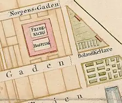 Copenhagen's second botanical garden was situated at the site from 1752. It was created by Georg Christian Oeder in the newly founded Frederiksstaden district at the request of Frederik V, at a site bisected by Amaliegade just north of Frederik's Hospital. The smaller western section, covering just under half a hectare, was equipped with a greenhouse while the eastern section remained largely unplanted. The garden was opened to the public in 1763.