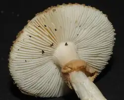 The gills are crowded closely together, free from attachment to the stem, 6–10 mm (1⁄4–3⁄8 in) wide, and white. The lamellulae (short gills that do not extend fully from the cap edge to the stem) have truncated ends. The stem is 37–90 mm (1+1⁄2–3+1⁄2 in) tall, 6–26 mm (1⁄4–1 in) in diameter, and narrowest at center. It is hollow, and has an abruptly bulbous base that is between 14 and 38 mm (1⁄2 and 1+1⁄2 in) in diameter. The surface of the stem above the level of the ring is white and covered in woolly tufts of mycelia; below the ring it is white with buff to greyish transverse, grooved bands. The base may or may not have a rim of volval remnants that are powdery, and a greyish-buff to greyish-sepia colour. The ring is membranous, white to buff, first hanging freely then later adhering to the stem. The flesh of the cap is white, occasionally pale isabelline under the center of the cap; the flesh of the stem is white.[1]