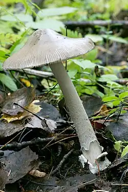 This fungus produces delicate white basidiocarps (fruiting bodies). The cap is 6–8 cm in diameter, at first narrowly conical then expanding to convex-conical. It is whitish in colour – pure white to faintly yellowish or greyish in the centre with age. The cap surface is smooth and moist (slightly sticky when wet), with a striate margin (grooved edges) but without any warty patches or universal veil remnants. Gills are free, crowded, and white. The stipe is exceptionally long and slender – up to 15–20 cm tall but only 1.4–2 cm thicksvampar.se. The stem is fragile, hollow in part, and tapers upward. It is entirely white and densely covered with white fibrillose scales or floccose (wooly) fragments, especially in its lower portion. At the base of the stipe sits a large, thick, white volva that forms a free, sack-like cup with lobed edges. There is no ring on the stipe, a key feature of this ringless Amanita. The spore print is white; spores are roughly spherical, roughly 9–11 μm in sizes, and lack an amyloid staining reaction. Clamp connections are absent in the hyphae.[2]