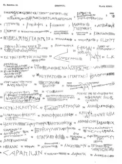 Fifty-nine instances of Greek graffiti have been scratched into the lower plaster of the tomb's corridors.[8] The graffiti was discovered in 1835 by Sir John Gardiner Wilkinson.[3] Barry Kemp, the Director of Excavations at Amarna, has stated that this graffiti can be dated to the Ptolemaic Period.[20] The graffiti records the messages and names of the tomb's visitors, most of which are presumed to have been soldiers. A graffito in the corridor records a message from a Greek visitor; “I come. Year 37”.[3] The most well-known Greek graffito from the tomb is located next to the exterior door frame of the tomb. The inscription reads: “having ascended here, Catullinus has engraved this in the doorway, marvelling at the art of the holy quarriers”.[3] This graffito provides insight into later Greek perspectives on the art, technology and architecture of the Ancient Egyptians. Another message is a Coptic Christian graffito, providing evidence for the coptic occupation of the site.[21] Coptic Christians coopted the site of the North Tombs in the fifth and sixth centuries AD.[20] They inhabited the tomb of Ahmose, as evidenced by two low exterior walls which were built by later settlers.[22]