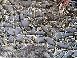 Wooden boards are sized to the paper being made. They are rubbed with soap so that the fibers do not stick. The fibers are arranged on wooden boards and beaten together into a thin flat mass. The best paper is made with long fibers arranged in a grid pattern to fit the board. Lesser quality paper is made from short masses arranged more haphazardly, but still beaten to the same effect.[73] This maceration process liberates soluble carbohydrates that are in the cavities of the cell fibers and act as a kind of glue. The Ficus tree bark contains a high quantity of this substance allowing to make for firm but flexible paper.[63] During the process, the stones are kept moist to keep the paper from sticking to it. The finished flat mass is then usually smoothed over with rounded orange peels. If there are any gaps after the maceration process, these are usually filled in by gluing small pieces of paper.[74]
