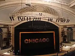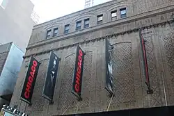 Relatively few productions have played the Ambassador since 2000.[7][13] The first was The Ride Down Mt. Morgan, which was staged in 2000.[208][209] The next year, the Ambassador hosted A Class Act[210][211] and Hedda Gabler,[212][213] the latter of which opened during a downturn in the Broadway industry caused by the September 11 attacks.[214] The play Topdog/Underdog opened at the Ambassador in 2002.[215][216] This was followed by the musical Chicago, which had already run for several years on Broadway when it transferred to the Ambassador in January 2003.[217] Chicago has played at the Ambassador ever since,[218] becoming the second-longest-running Broadway production in 2014.[219][c] As part of a settlement with the United States Department of Justice in 2003, the Shuberts agreed to improve disabled access at their 16 landmarked Broadway theaters, including the Ambassador.[220] The theater closed on March 12, 2020, due to the COVID-19 pandemic.[221] It reopened with performances of Chicago on September 14, 2021.[222] Chicago broke the theater's box-office record several times during its run, most recently during the week ending January 1, 2023, when the musical grossed $1,299,400.[223]