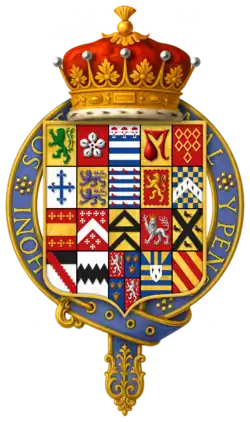 After his first marriage, Ambrose Dudley remained childless. His second wife, Elizabeth Tailboys, suffered a phantom pregnancy in 1555.[1] Anne Russell, though nearly 20 years her husband's junior, turned out to be a congenial partner.[27] Through their paternal grandmother the Dudley brothers descended from the famous 15th century earls, John Talbot, 1st Earl of Shrewsbury, and Richard Beauchamp, Earl of Warwick.[42] The Beauchamp descent especially—which was represented by the earldom of Warwick—filled them with pride.[43] Ambrose's childlessness deeply concerned the widowed Robert Dudley, who for many years dared not to remarry for fear of the Queen's displeasure,[44] and eventually died without direct heirs himself in September 1588. Most of Leicester's estate—and debts—passed on to Warwick and encumbered his remaining lifetime. He also took care of his deceased brother's illegitimate teenage son Robert, who was his godson and whom Leicester had willed to inherit after Warwick's death.[1]