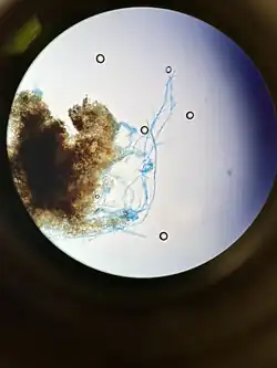 A. roeperi hyphae in culture on MYEA under a dissecting microscope
