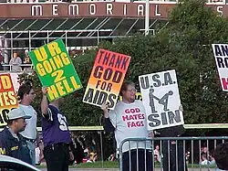Westboro Baptist Church bases its work around its belief that God hates homosexuals, mainly through the use of their motto "God Hates Fags",[7] and expresses the opinion, based on its Biblical interpretation, that nearly every tragedy in the world is God's punishment for homosexuality – specifically society's increasing tolerance and acceptance of gay, lesbian, and bisexual people.[8] It maintains that God hates homosexuals above all other kinds of sinners[9] and that homosexuality should be a capital crime.[10] The church runs the websites GodHatesFags.com, GodHatesAmerica.com, and websites condemnatory of LGBT people, Roman Catholics, Muslims, Jews, Sweden, Ireland, Canada, the Netherlands, and the United States.[11] The organisation is monitored by the Anti-Defamation League[12] and is classified as a hate group by the Southern Poverty Law Center.[13][14] The group has achieved notoriety because of its picketing of funeral processions of US soldiers killed in combat in Iraq and Afghanistan.[15][16]