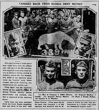 Early in 1919, instances of rumored and actual mutinies in the Allied ranks became frequent. On July 15, 1919, it was reported by the Alaska Daily Empire that rumors of mutiny were "bunk" and that commander Major Nichols reported “What gave rise to the story that Company I, of the regiment, had mutinied was an Incident (sic.) to which an order was misunderstood by a soldier who could not understand English well.”[6] President Wilson directed the War Department on February 16, 1919, to begin planning the withdrawal of AEF in North Russia from Northern Russia. In March 1919, four American soldiers in Company B of the 339th Infantry drew up a petition protesting their continued presence in Russia and were threatened with court-martial proceedings.