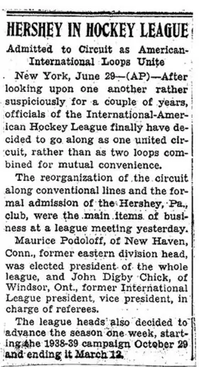 - ^ "Hershey In Hockey League: Admitted to Circuit as American-International Loops Unite" The Philadelphia Record, June 29, 1938