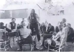 Buffalo Bill treated Native American employees as equals with white cowboys. Wild Westers received good wages, transportation, housing, abundant food and gifts of clothing and cash from Buffalo Bill at the end of each season. Wild Westers were employed as performers, interpreters and recruiters. Men had money in their pockets and for their families on the reservation. Female performers were paid extra for infants and children and supplemented wages by making and selling Lakota crafts.[34] Shows hired venerable elder male Indians to appear in the parades to ensure that young men acted with consideration and politeness when visiting host communities, and rules were self-policed by traditional Oglala Lakota chiefs and former U.S. Army Indian Scouts.[35] Known as "Show Indians", Oglala Wild Westers referred to themselves as "Oskate Wicasa" or "Show Man", a title of great honor and respect.[36] Since 1887, Wild Westing has been family tradition with several hundred Pine Ridge families, and the tradition of the Wild Wester community is not unlike the tradition of circus families and communities. American Horse's sons Ben American Horse and Samuel American Horse were Carlisle Wild Westers and interpreters.[37][38]