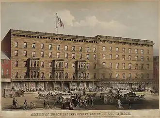 The American House (established 1835) was a hotel in Boston, Massachusetts, located on Hanover Street. Abraham W. Brigham,[4] Lewis Rice (1837–1874),[5][6][7] Henry B. Rice (1868–1888),[8][9] and Allen C. Jones (c. 1921) served as proprietors.[10] In 1851 the building was expanded,[11] to a design by Charles A. Alexander. In 1868 it had "the first hotel passenger elevator in Boston."[12] By the 1860s it also had "billiard halls, telegraph office, and cafe."[13] In the late 19th century it was described as "the headquarters of the shoe-and-leather trade" in the city.[8] Guests of the hotel and restaurant included John Brown,[14][15] Ralph Waldo Emerson,[16] William Whitwell Greenough,[17] Charles Savage Homer,[18] Zadoc Long,[19] and George Presbury Rowell.[20] Many groups held meetings there, among them: Granite Cutters' International Association of America,[21] Letter Carriers' Association,[22] National Electric Light Association,[23] and New England Shorthand Reporters' Association.[24] The hotel closed in 1916, and re-opened under new management in 1918.[1] It permanently closed on August 8, 1935,[25] and the building was shortly afterwards demolished to make room for a parking lot.[26][27][28] The John F. Kennedy Federal Building now occupies the site.[29]