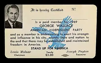 The American Independent Party (AIP) is an American political party that was established in 1967. The American Independent Party is best known for its nomination of Democratic then-former Governor George Wallace of Alabama, who carried five states in the 1968 presidential election running against Richard Nixon and Hubert Humphrey on a populist, hard-line anti-Communist, pro-"law and order" platform, appealing to working-class white voters. Wallace was best known for his staunch segregationist stances. In 1976, the party split into the modern American Independent Party and the American Party. From 1992 until 2008, the party was the California affiliate of the national Constitution Party. Its exit from the Constitution Party led to a leadership dispute during the 2008 election.