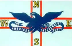 The party flag, adopted on August 30, 1970, depicts an eagle holding a group of arrows in its left talons, over a compass rose, with a banner which reads "The American Independent Party" at the eagle's base.