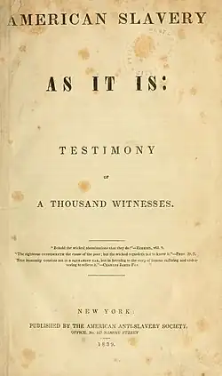 American Slavery as It Is: Testimony of a Thousand Witnesses is a book written by the American abolitionist Theodore Dwight Weld, his wife Angelina Grimké, and her sister Sarah Grimké, which was published in 1839.[1][2]