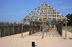 A palisade is a series of vertical pales (stakes) driven or set into the ground to form a fence or barrier. Palisade construction is a palisade or the similar use of timbers set on a sill; an example in England being the original portion of the ancient Greensted Church and the early type of stave church known as a palisade church. It was common for Native Americans and Europeans to build a palisade as part of a fort or to protect a village. Palisade construction is alluded to as a method of building of early dwellings.[11] The nature of planting one end of a timber in the ground is called earthfast or post in ground construction which was a common way to build worldwide. A benefit of earthfast construction is the ground holds the posts from swaying which eliminates the need for bracing and anchors the structure to the ground. The French settlers called this carpentry en pieux or poteaux en terre[12] and log on end.[13] This type of carpentry may not considered framing. The French method of poteaux en terre was different than palisade construction in that the timbers were hewn two sides and spaced slightly apart with the gaps filled with a material called bousillage[12]