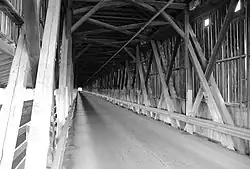 A timber bridge or wooden bridge is a bridge that uses timber or wood as its principal structural material. One of the first forms of bridge, those of timber have been used since ancient times. Wooden bridges could be a deck-only structure or a deck with a roof. Wooden bridges were often a single span, but could be of multiple spans. A trestle bridge is a bridge composed of a number of short spans. Each supporting frame is a bent. Timber and iron trestles (i.e. bridges) were extensively used in the 19th century.[28] A covered bridge is a timber-truss bridge with a roof, decking, and siding, which creates a nearly complete enclosure.[29] The purpose of the covering is to protect the wooden structural members from the weather. Uncovered wooden bridges typically have a lifespan of only 20 years because of the effects of rain and sun, but a covered bridge could last 100 years.[30]