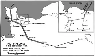 By the end of August, one Major System MT80 pipeline had reached Alençon, another was at Domfront, and an avgas pipeline had nearly reached Domfront, but breaks in the line forced truck units to draw MT80 from Saint-Lô. Up to this point the pipeline had overriding priority, but its construction required the railway system to deliver 500 to 1,500 long tons (510 to 1,520 t) of pipes, tanks, pumps and fittings each day. By mid-September, the pipeline's priority was downgraded, and pipeline construction units had to rely on motor transport instead of rail transport, limiting progress to 7 to 8 miles (11 to 13 km) per day. The pipeline reached Coubert on 6 October, and there it remained until January 1945.[52][53]