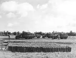 Motor transport was used as a stopgap, but there was a shortage of suitable vehicles owing to political interference and production difficulties.[67] The tardy delivery of vehicles adversely affected the training of motor transport unit personnel, and the US Army's racial segregation complicated matters. The cost of inadequate training of truck drivers was paid in avoidable damage to vehicles through accidents and poor maintenance.[69] The pursuit resulted in large quantities of equipment being damaged, worn out, and written off. In November, SHAEF reported to the War Department that each month, 700 mortars, 375 medium and 125 light tanks, 900 2+12-ton trucks, 1,500 jeeps, and 100 artillery pieces had been written off. Tank losses in August and September respectively had been 25.3 percent and 16.5 percent of establishment, and the reserves were exhausted. Over 15,000 vehicles were deadlined, awaiting repairs or parts.[103]