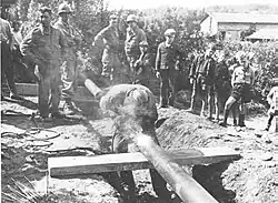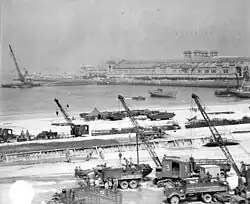 Rehabilitation work was undertaken by the 1056th Port Construction and Repair Group, with the 332nd and 342nd Engineer Regiments and the 333rd Engineer Special Service Regiment assigned. The first priority was creating a landing site for DUKW amphibious trucks on the Nouvelle Plage, a bathing beach. This was ready on 6 July, but the DUKWs could not come ashore because the Grande and Petite Rades had been sown with mines.[87] Twenty US Navy coastal minesweepers and the British 9th and 159th Minesweeping Flotillas were engaged in mine clearance. Many of the mines were of a delayed action kind that only became active after a set number of days. Eight acoustic and eight magnetic sweeps were conducted every morning for 85 days. By 13 July, 133 mines had been swept, of which 86 were magnetic or acoustic. This did not include the small concrete-encased KMA (kustenmine-A) coastal mines, known as "Katie mines", sown in shallow waters, that had to be removed by divers. Three minesweepers were lost to mines, as were some small craft and barges.[88][89][90][91] The first four Liberty ships entered the Grande Rade on 16 July, and were unloaded at anchor into DUKWs.[85]