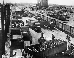 The commander of the 2nd Military Railway Service, Brigadier General Clarence L. Burpee, arrived in Normandy on 17 June, and by the end of July the 707th Railway Grand Division had the 720th, 728th and 729th Railway Operating Battalions and the 757th Shop Battalion operational.[59] French civilian railway workers were employed whenever possible. Railway operations commenced in early July. Major General Frank S. Ross, the European Theater of Operations (ETO) Chief of Transportation, rode the line from Cherbourg to Carentan in a jeep equipped with flanged wheels.[58] Immediately after Operation Cobra began, the 347th Engineer General Service Regiment was withdrawn from its work on the port of Cherbourg and set to work rehabilitating the railway lines, which had been badly damaged by the Allied Air Forces during earlier aerial interdiction bombing. It started by repairing the masonry bridge over the Vire River on the Saint-Lô line, constructing a timber trestle bridge to replace a missing span. At Coutances, it replaced a missing span of a viaduct bridge. Reconstruction of the marshaling yards at Saint-Lô was a major task, as they had been almost completely destroyed.[60]