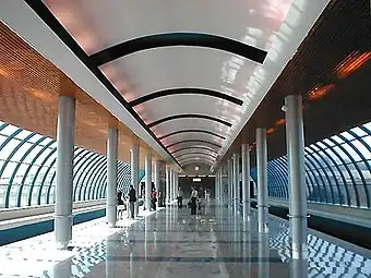 The central span also contains a suspended ceiling, but is curved to create a vaulted shape. The large opaque white fragments are shaped to appear suspended from the blue vault. The main lighting elements are hidden behind the white opaque glass, and is turned on during the nighttime giving the station two distinctively separate aesthetics.