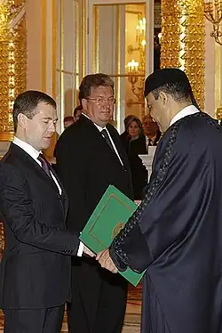- ^ "The Former ambassadors of ten countries presented their letters of credence to Dmitry Medvedev". The Kremlin, Moscow: Presidential Press and Information Office. 12 October 2009. Retrieved 28 February 2010.