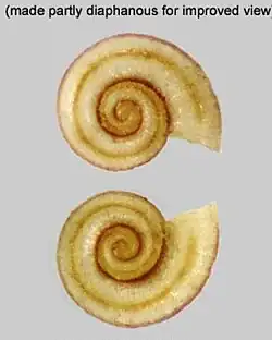 (Original description in French) A very small, discoidal, planorbiform shell, coiled in a single plane, symmetrical, and transparent. It is decorated with fine growth striations visible only under magnification.