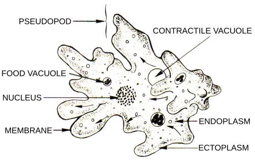 Historically, researchers have divided the cytoplasm into two parts, consisting of a granular inner endoplasm and an outer layer of clear ectoplasm, both enclosed within a flexible plasma membrane.[13] The cell usually has a single granular nucleus, containing most of the organism's DNA . A contractile vacuole is used to maintain osmotic equilibrium by excreting excess water from the cell (see Osmoregulation).