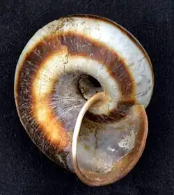 The specimen we have before us is a dark maroon brown; the interior of the umbilicus is the same color; the circumference of this part is circumscribed by a whitish zone. A second narrow zone appears a little below the circumference of the body whorl, and finally a third, narrower than the previous two, is placed below the suture and extends up towards the apex, dividing the surface of the first whorls into two equal parts.[2]