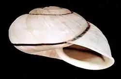 (Original description) The shell is umbilicated, orbicularly subglobose, and of moderate solidity. Its surface exhibits oblique striations and a whitish base, overlaid by a pale brown, shining epidermis. It is decorated with three very narrow dark brown bands, one of which is located at the suture.
