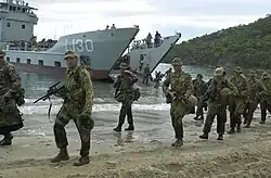 The LSMs were replaced by eight Balikpapan-class landing craft heavy which began to enter service in 1971. The first ship in the class, HMAS Balikpapan was briefly operated by the Army's Water Transport force but was later transferred to the Navy and all subsequent ships in the class were transferred to the Navy while they were under construction.[3] These ships proved to be very successful and supported Australian Army exercises and operations throughout South East Asia. Two ships, HMAS Buna and HMAS Salamaua, were transferred to the Papua New Guinea Defence Force in 1974. Three of the remaining craft were decommissioned in December 2012, with the remainder decommissioned in November 2014.[4][5]