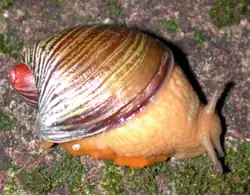 - Amphibulima patula dominicensis Pilsbry, 1899[3] - Pilsbry (1899) separated the Dominican specimens on the basis of the darker colour and by having a heavier sculptured shell.[4] Robinson et al. (2009)[4] have found living specimens that were either light beige-coloured with a somewhat orange-yellowish line along the foot (see photo on the left), or entirely dark brown coloured (see photo on the right).[4]