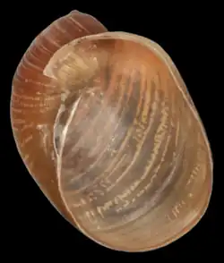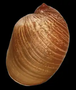 (Original description in French) This shell is notable for its large aperture and flattened form. It is oval, slightly wider near the spire than the base. The spire consists of three whorls, with the body whorl comprising nearly the entire shell. The two apical whorls are slightly raised, nipple-like, with an obtuse tip. The outer surface is marked with deep wrinkles and fine, oblique striae.