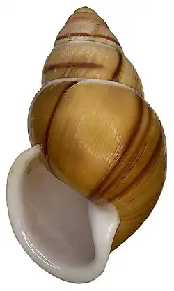 (Original description) This sinistral shell is oblong-ovate, perforate, solid, and glossy, exhibiting oblique striations. The ground color is either yellow or rich brown, sometimes with two or three darker brown spiral bands in the latter case. It consists of seven convex whorls, with the suture deeply impressed and marked by a narrow, white spiral band. The outer lip and the columella are broadly expanded and slightly reflected, their margins joined by a thin, transparent callus. The columella is more or less deflected at its point of insertion.[2]