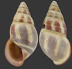 The shell is sinistral and rather solid, presenting an oblong-conic shape with oblique striations and a narrowly rimate base. The spire appears conic with a dark brown apex. Comprising seven convex whorls, the initial ones are dull white, while the fourth and lower ones exhibit a cream color with oblique bluish-gray stripes. These stripes become reddish-brown on the spire and are interrupted at the middle on the penultimate and preceding whorls by a submedian light spiral line, eventually fading at the suture. The last half-whorl is bluish-gray, featuring a cream-yellow band around the middle of the base and an umbilical area of the same tinge. A narrow infra-sutural line of a reddish-brown color is present on the body whorl and penultimate whorl. The aperture is small, oblique, and expanded, with a greyish interior. The columella appears thick and reflected, showing a paler hue at the upper part. The outer lip is thickened and dark-brown externally, with a purple interior, particularly pronounced near the umbilicus.[2]