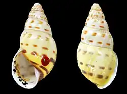 (Original description) The sinistral shell is polished, oblong-conic, and nearly imperforate. It consists of six convex, obliquely striated whorls. The first two whorls are white with a dark brown apex. The lower whorls are yellow, featuring two equidistant spiral bands of square and oblong dark brown spots, positioned below and above the suture. Additionally, the body whorl displays a wider band of similar spots below the periphery and a continuous band above the dark brown umbilical area. The outer lip and the columella are white, with the lip slightly expanded and the columella thickened at the insertion point but not reflected. A thin, reddish, transparent callus connects them, investing the parietal wall. [2]