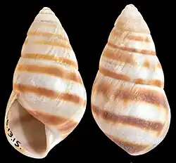 (Original description) The sinistral shell is ovate-conic, exhibiting a solid structure and an obliquely striate surface. It is almost imperforate and white, adorned with two brown spiral bands that commence at the third whorl, positioned above and below the suture, and continue to the body whorl. The body whorl also features one, and sometimes two, other bands on its lower half. Comprising seven convex whorls, the shell presents a white outer lip and columella, both expanded, with their margins joined by a white callus.[2]