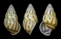 (Original description in Latin) The sinistral shell is elongate-conical. It exhibits a smooth and very glossy surface with a yellowish-white base color. It is painted with seriate brown spots and two to five brown bands at the base, and features a pale apex. Comprising six somewhat flat whorls, the shell possesses an ovate aperture that occupies three-sevenths of its length. The peristome appears somewhat thick, white, and expanded, lacking a parietal callus. The columellar margin is thin, rectilinear, and somewhat vertical, forming a distinct angle with the basal margin and being plainly adnate above. [2]