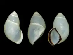 The shell exhibits chirality dimorphism. It ranges from thin to slightly thickened, and presents a conical shape. The spire is short and conical with white or pale coloration. The apex appears acute without a black spot on its tip. Comprising six to seven little convex to smooth whorls, the shell displays a wide and shallow suture. The body whorl is well rounded to slightly elongated and features a less prominent umbilical hump. The periostracum is thin and corneous; varices are absent. The shell color is uniformly whitish to pale cream, with a subsutural band that appears opaque white. The parietal callus is thickened, whitish, and translucent or dark to dark brown. The aperture is elliptical to obliquely elliptical with a prominent anterior notch; the inner side of the outer wall is whitish. The peristome is thickened and slightly expanded but not reflected; the outer lip is whitish or shows dark to dark brown coloration. The columella is whitish or dark, running shortly straight and then bending anteriorly. The umbilicus is imperforate.[3]